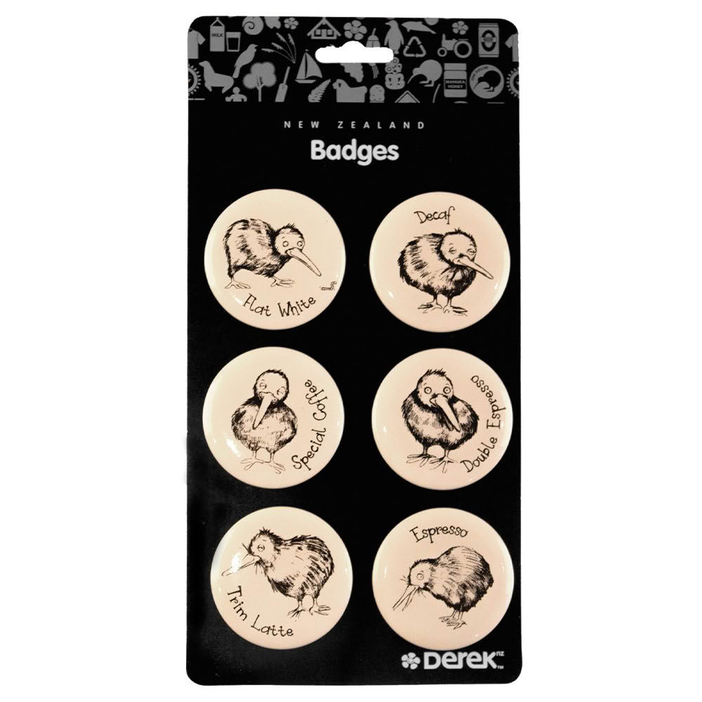 6 pieces badges with our Caffeinated Kiwi design printed on.