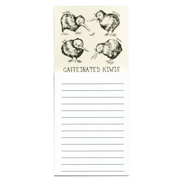 Spiral bound notebook with Caffeinated Kiwis design print on laminated front cover. Plain paper A6 size.