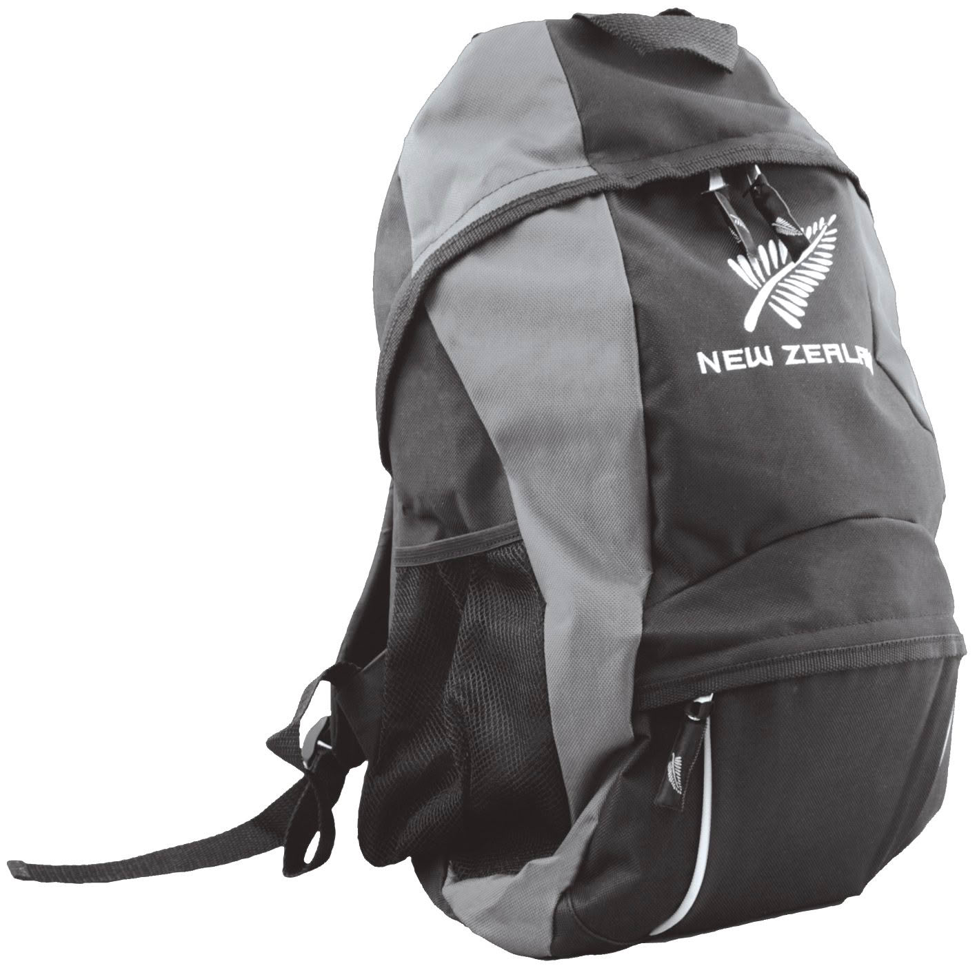 Outer made with shower proof 600D Polyester. Padded back panel. Zip Front pocket, Inside pockets, Side mesh pockets. Height 44cm. Width 26cm. Depth 18cm. Embroidered fern design.