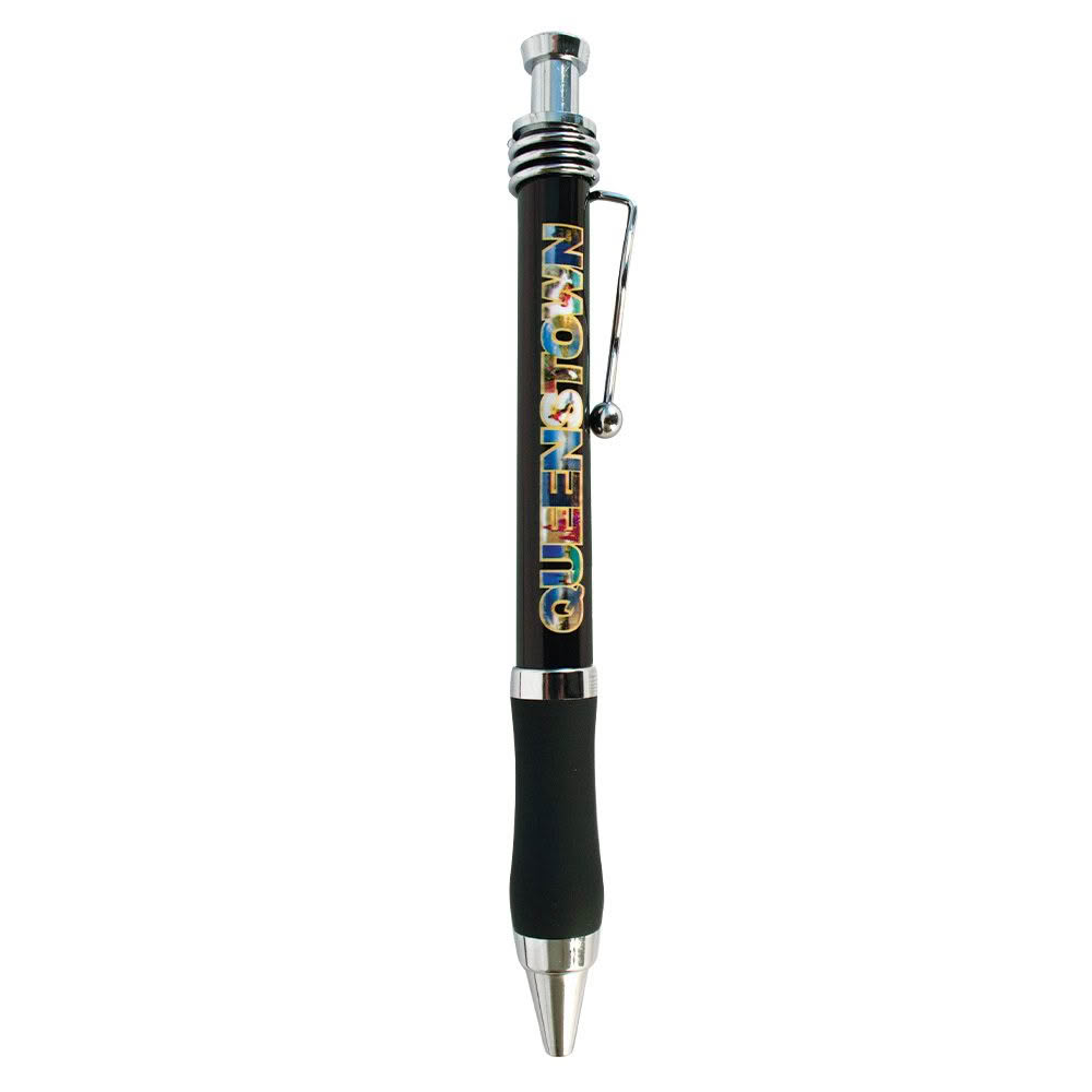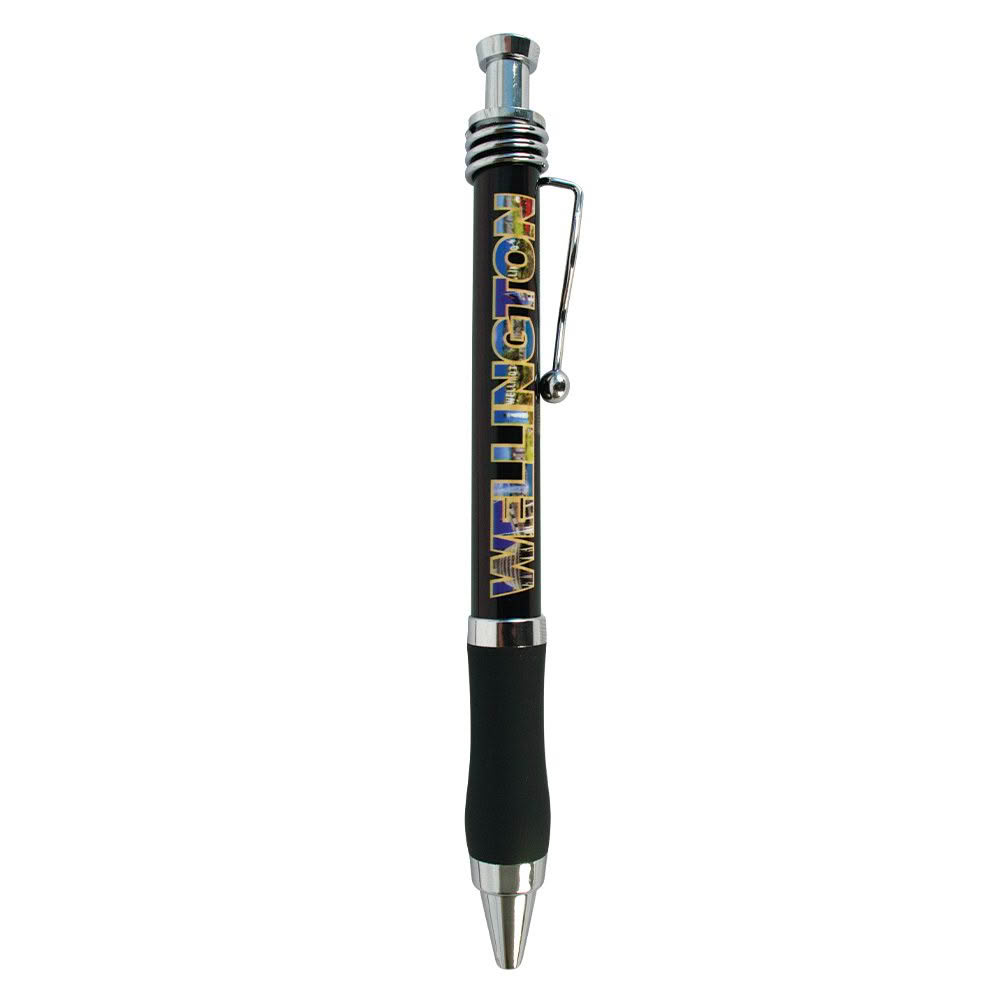Metal pen with New Zealand Regions print design on outer pen. Comfortable and ergononically designed rubber grip to make writing easy. Retractable click top and refillable ball pen with metal clip with black ink.